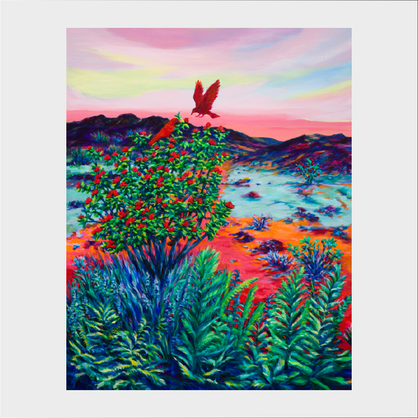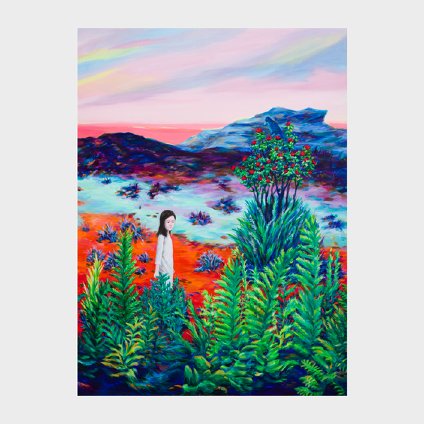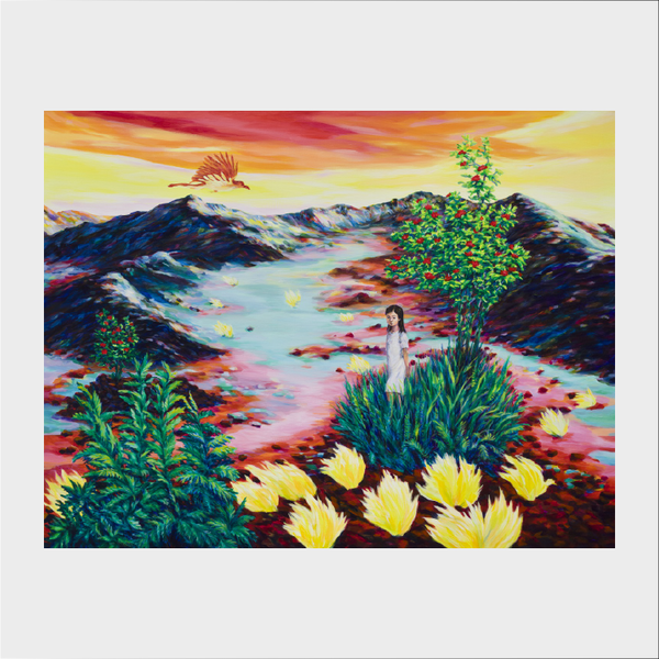 하와이 까마귀나 오히아레후아, 어린 소녀는 현재는 연약하지만 미래의 지속을 상징한다. 모든 것을 품고 생명을 키워내는 붉은 땅은 소녀의 미래를 상징한다. <오히아레후아와 소녀>의 자연은 이중의 의미가 있다. 첫 번째, 용암과 재로 덮인 나무가 자라는 들은 소녀가 성장하는 과정에서 힘든 현재의 사회 환경 등 다양한 어려움을 상징한 풍경이다. 두 번째는 초록 풀과 붉은 꽃 등 생명력이 가득한 자연으로 회복할 수 있는 쉼터와 안식처를 상징한다. 빅아일랜드의 화산 풍경 속에서 강인하게 살아가는 오히아레후아와 까마귀들, 브레드트리 등을 통해 현대 사회 속에서 힘겹게 살아가는 우리의 모습을 비유하여 표현했다.
