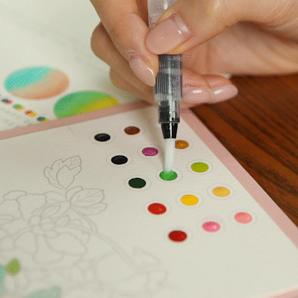 워터 브러시를 눌러 붓에 물을 묻힌 뒤, 물감을 발색하세요.