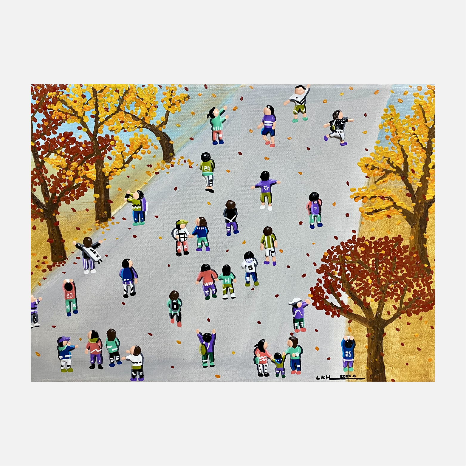 이경현 작가는 현대인의 일상을 멀리서 바라보며, 그 안에 담긴 관계와 감정을 포착합니다. 그의 화면에는 표정 없는 인물들이 반복적으로 등장하지만, 그 무표정 속에는 각기 다른 이야기가 숨어 있습니다. 일상의 군상들은 때로는 유머러스하게, 때로는 쓸쓸하게 그려지며, 분주한 삶 속에서 우리가 잊고 지내는 감정의 결을 환기시킵니다. 작가는 사람과 사회, 그리고 그 사이의 거리에서 생겨나는 미묘한 긴장과 공허를 섬세한 시선으로 풀어냅니다. 멀리서 보면 일정한 리듬으로 움직이는 작은 인물들이 하나의 패턴처럼 보이지만, 가까이 다가가면 각자의 제스처와 색감이 고유한 존재로 드러납니다. 이경현 작가의 작품은 개인과 사회의 관계, 익명성과 존재의 의미를 동시에 사유하게 합니다. 단순한 풍경처럼 보이지만, 그 안에는 우리가 살아가는 시대의 모습과 감정이 응축되어 있습니다.